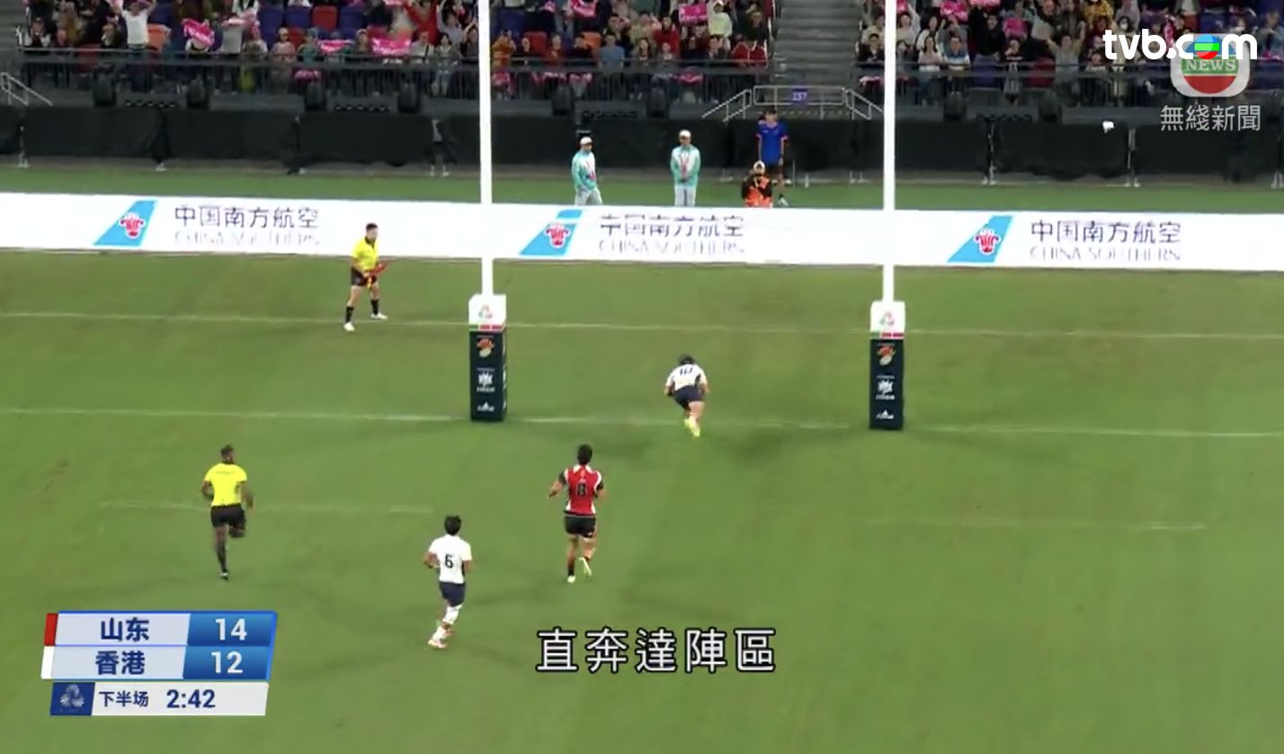 下半場再有馬豪翔在邊路成功突破,加上之後的附加踢,一共拿到7分,為山東反先14-12。不過,港隊靠于力仁在餘下2分多鐘時,在中路找到空位,直奔達陣區,取得他今屆首次「達陣」,為港隊再度領先。