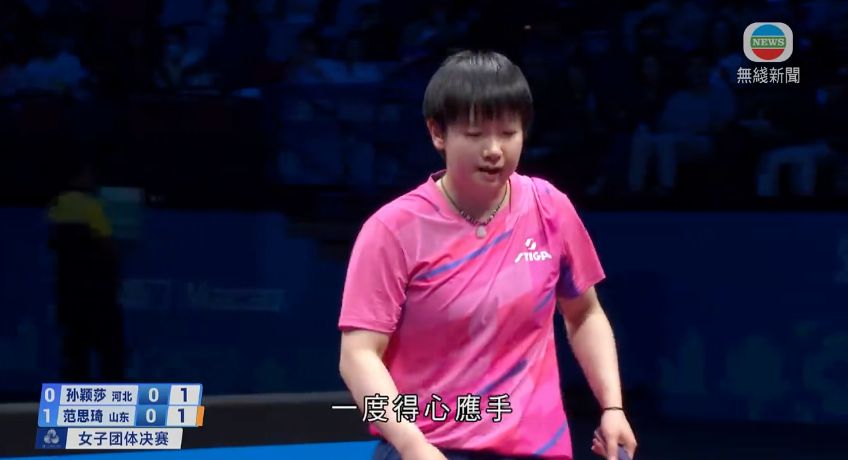 河北到世界「一姐」孫穎莎登場,一度得心應手,起板就有,令女單次圈就出局的范思琦淪為陪練員,加力又有,贏11-5後,第二局有精彩攻防戰,孫穎莎是主導一位,將范思琦打離枱,但遲遲未能解決,嘗試變線,冷不防對方還擊反拉,范思琦有得分力,孫穎莎這局落後8-9才連取3分,贏多局11-9,之後輸回一局10-12。不過第四局,她再贏11-5,以局數3-1,為河北追平場數。