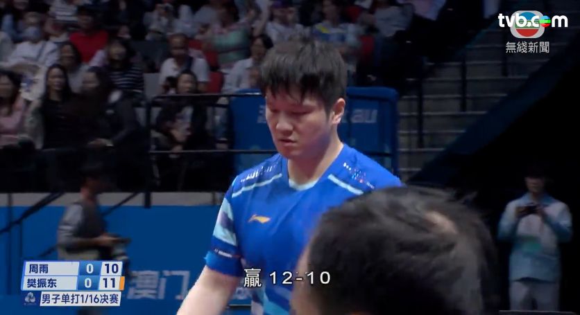 乒乓32強,藍衫的樊振東登場,這位上海代表,面對河北的周雨,正手上旋,博到對方犯錯,首局打到「刁時」,贏12-10。