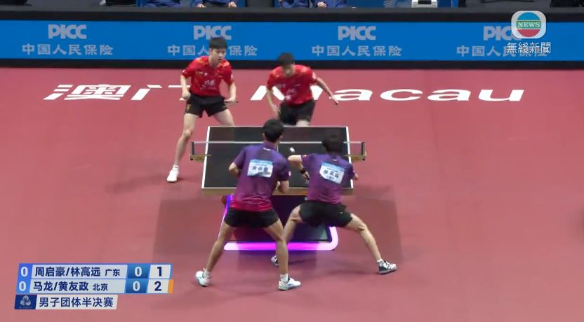 紅衫的北京,由馬龍及黃友政,雙打面對廣東的林高遠及周啟豪。開局領先5-1,到10-8時贏不到,被對方逼到「刁時」再反先。馬龍今屆只參加男團,欣賞這一球,一下反拉,北京再超前。高手過招,互有領先。到林高遠拉中路追身。這局最終經六次「刁時」,北京贏才17-15。