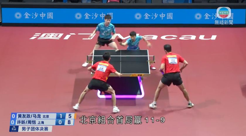 北京組合首局贏11-9,第二局就輸回5-11,離枱對拉,被譽為「國乒三劍客」的馬龍與許昕直接交鋒,看一次少一次。