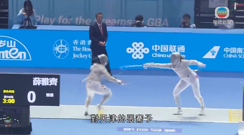 在啟德體藝館上演的女子佩劍團體賽,五至六名次賽,由右方的薛雅齊為港隊「打頭陣」,對天津的張騫予,港隊在八強3分不敵廣東,轉戰名次賽,前一場擊敗北京,再鬥天津爭第五。
