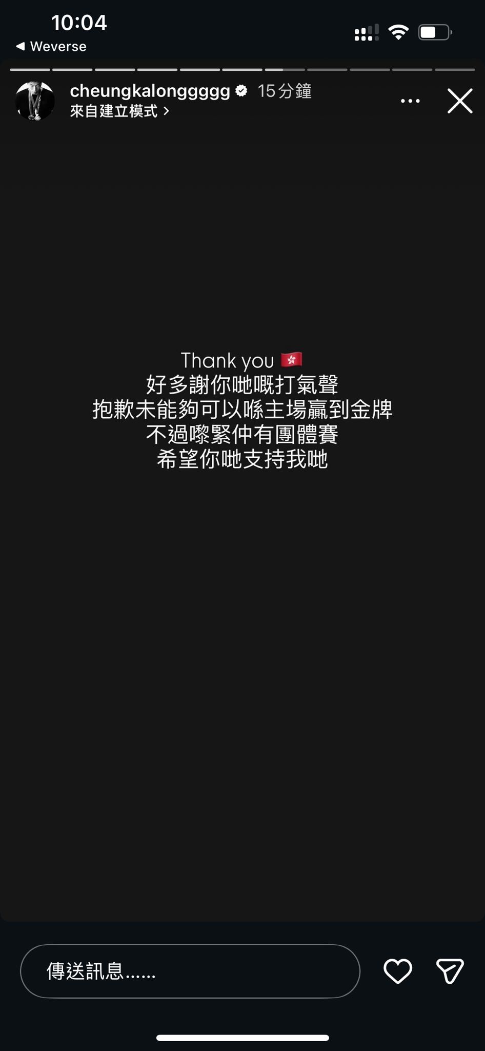 他受訪時指感讚港人到場支持:「其實他們的支持,對我們來說,尤其是對我來說是很大的動力。尤其是我很累的時候,我聽到他們可能一句,很簡單『張家朗加油』,我已經覺得不能辜負這些人。」而他指輸掉四強十分可惜,覺得自己狀態非常好,但沒有好好抓住這個機會。