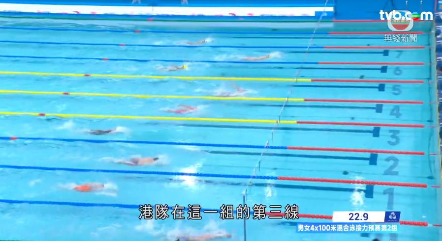 男女4x100米混合泳接力,港隊在這一組的第三線。張心悅負責第一棒、游背泳,一直都落後其他對手。
