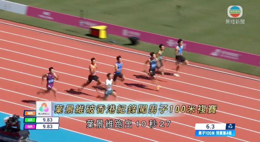全運會田徑|葉景維男子100米初賽破香港紀錄!小組第四名衝線闖複賽點讚分享撰文:打邊爐 發佈日期:2025-11-17 03:01 更新日期:2025-11-17 03:16全運田徑男子100米初賽,葉景維跑出破香港紀錄時間,晉級複賽。全運會田徑|葉景維男子100米初賽破香港紀錄!小組第四名衝線闖複賽葉景維被編在第四組第二線。初賽20位跑手分成四組,每組頭三名直接入複賽,最後四個席位由其餘成績最好的四名跑手奪得。葉景維跑出10秒27,小組第四名衝線,足夠以最佳成績之一晉級複賽。他除了跑出個人最佳時間,亦將徐志豪和吳家鋒一同保持的香港紀錄,推前0.01秒。#全運會2025#全運會#第十五屆全國運動會#田徑