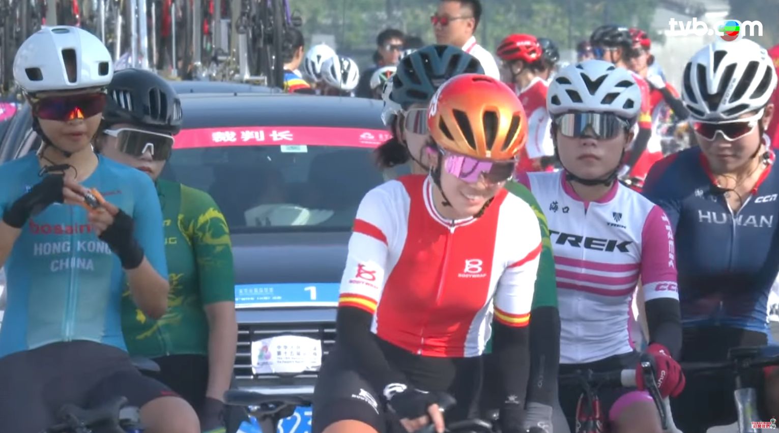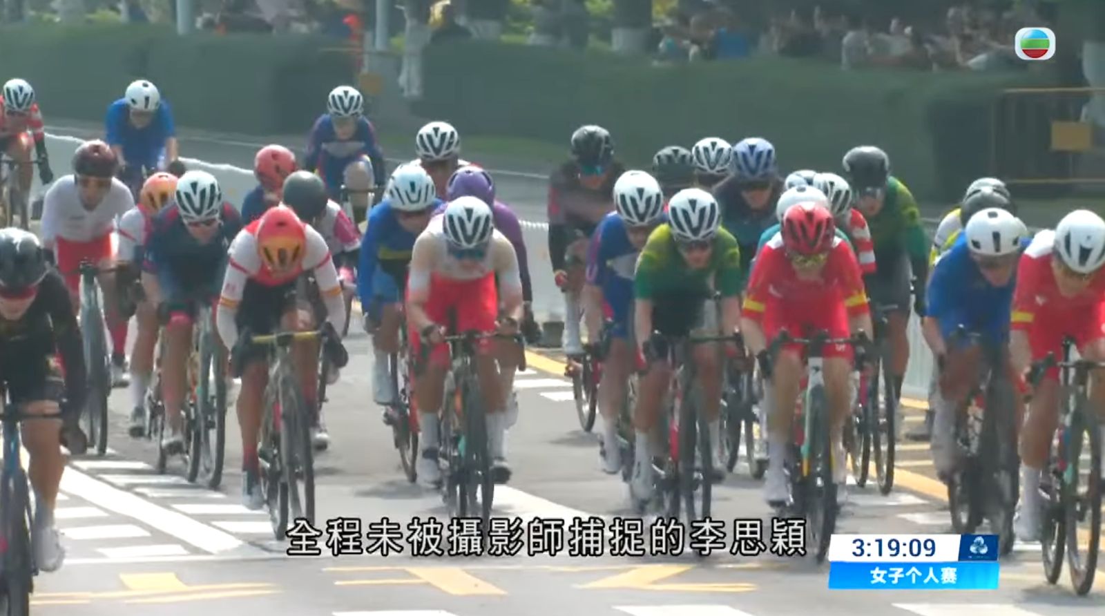 一班車手包括港隊的李思穎,留在主車群,默默向金牌逐夢前行。梁穎儀說過全力協助,她在主車群較前位置。