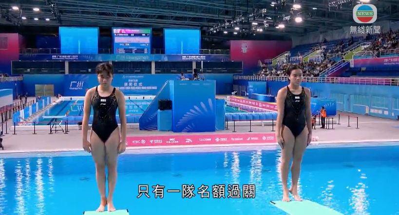 全運女子雙人三米板跳水,廣東的陳藝文和林珊,初賽首名晉級。港隊以21名完成,無緣決賽。