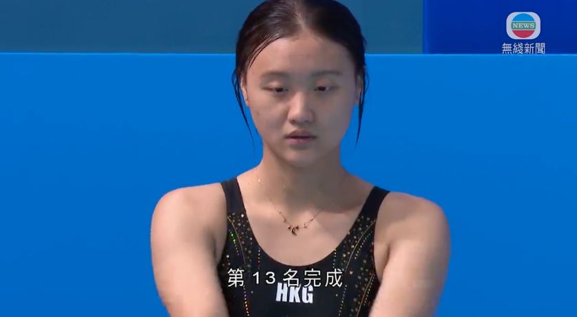 澳門代表、14歲的梁欣宜,在第一跳,難度系數1.7的向前翻騰一周半屈體,亦出現失誤,背部落水「炸起水花」,被判零分。首次參加全運的她,之後四跳中,最佳成績是36.3分,最終亦以包尾完成。
