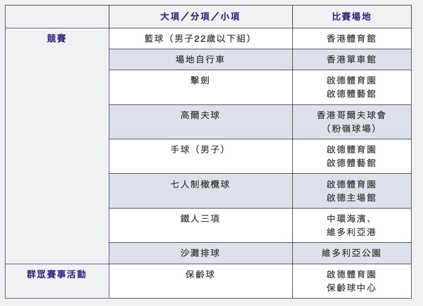 - 啟德體育園:手球、七人制橄欖球、劍擊、保齡球(群眾賽事活動)