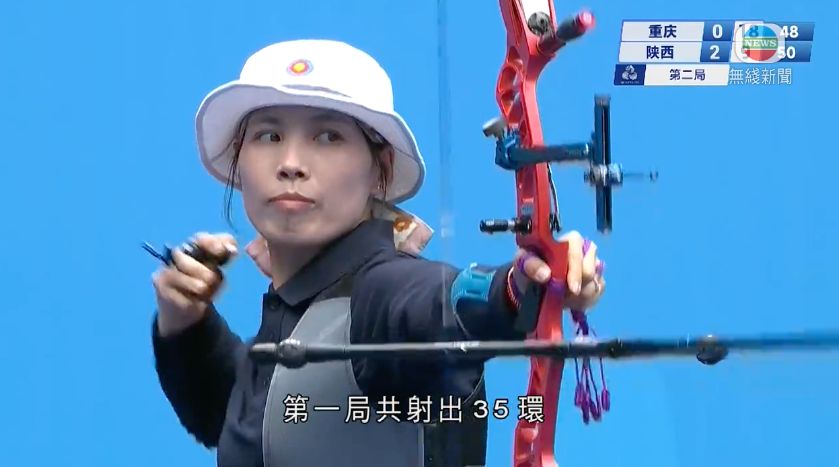 左方陝西的王思俊及吳春艷,第一局共射出35環,領先重慶2分。這項反曲弓混合團體公開級淘汰賽,每場鬥四局,每局限時80秒。各隊兩人輪流共射四箭,單局勝出可獲2分。