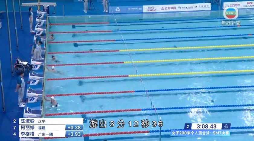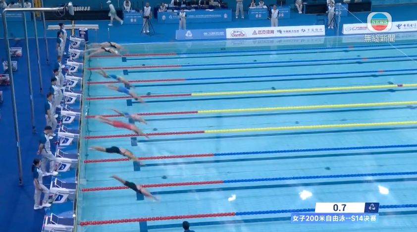 女子S14級200米自由泳決賽,八位泳手中,港隊佔三席。分別順序在第三、四、五線的,陳睿琳、劉肖儀和張可盈。其中第四線的劉肖儀反應時間全場第四,她由頭帶到尾,只有另一港隊代表陳睿琳,能威脅到她的位置。