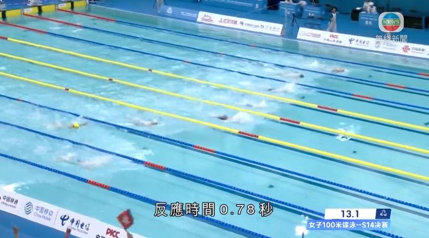 第四線的陳睿琳,爭取今屆個人第三金,反應時間0.78秒。完成頭50米,已經取得領先。