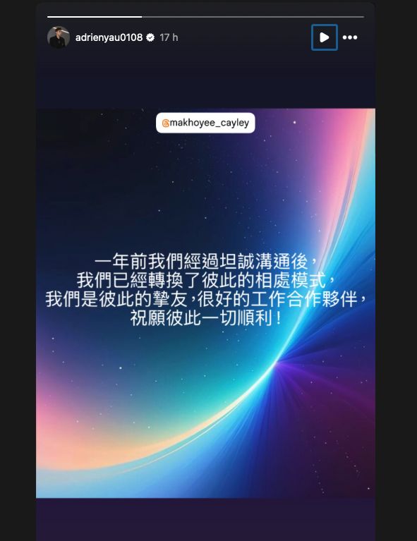 二人於IG的限時動態留言:「一年前我們經過坦誠溝通後,我們已經轉換了彼此的相處模式,我們是彼此的摯友,很好的工作合作夥伴,祝願彼此一切順利!」