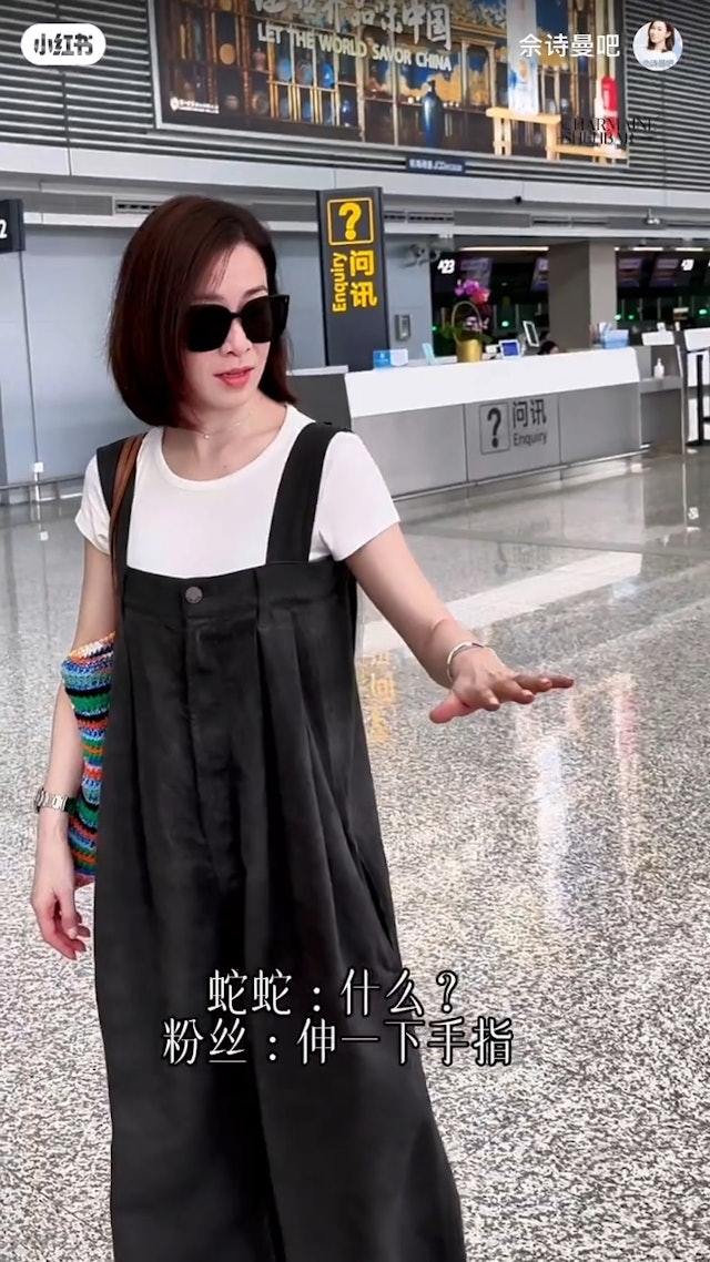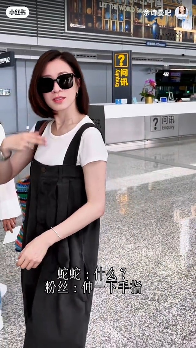 昨日(19日),阿佘一內地粉絲團的小紅書帳號發布了一段影片,見阿佘戴著副黑超出現在機場,而正當她伸手入手袋拿東西的時候,突然有人從旁問她可不可以伸出手指。阿佘極速收拾,並大方伸出左手,而後,便見到有人為她左手的無名指套上戒指,阿佘即時露出甜笑!