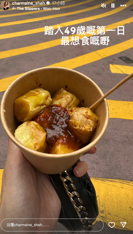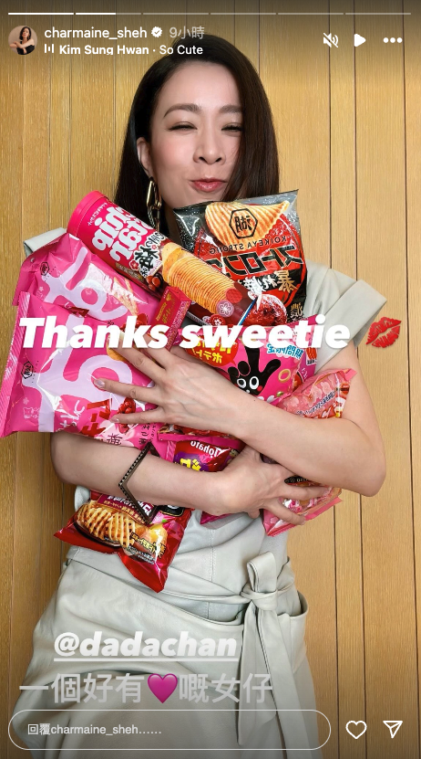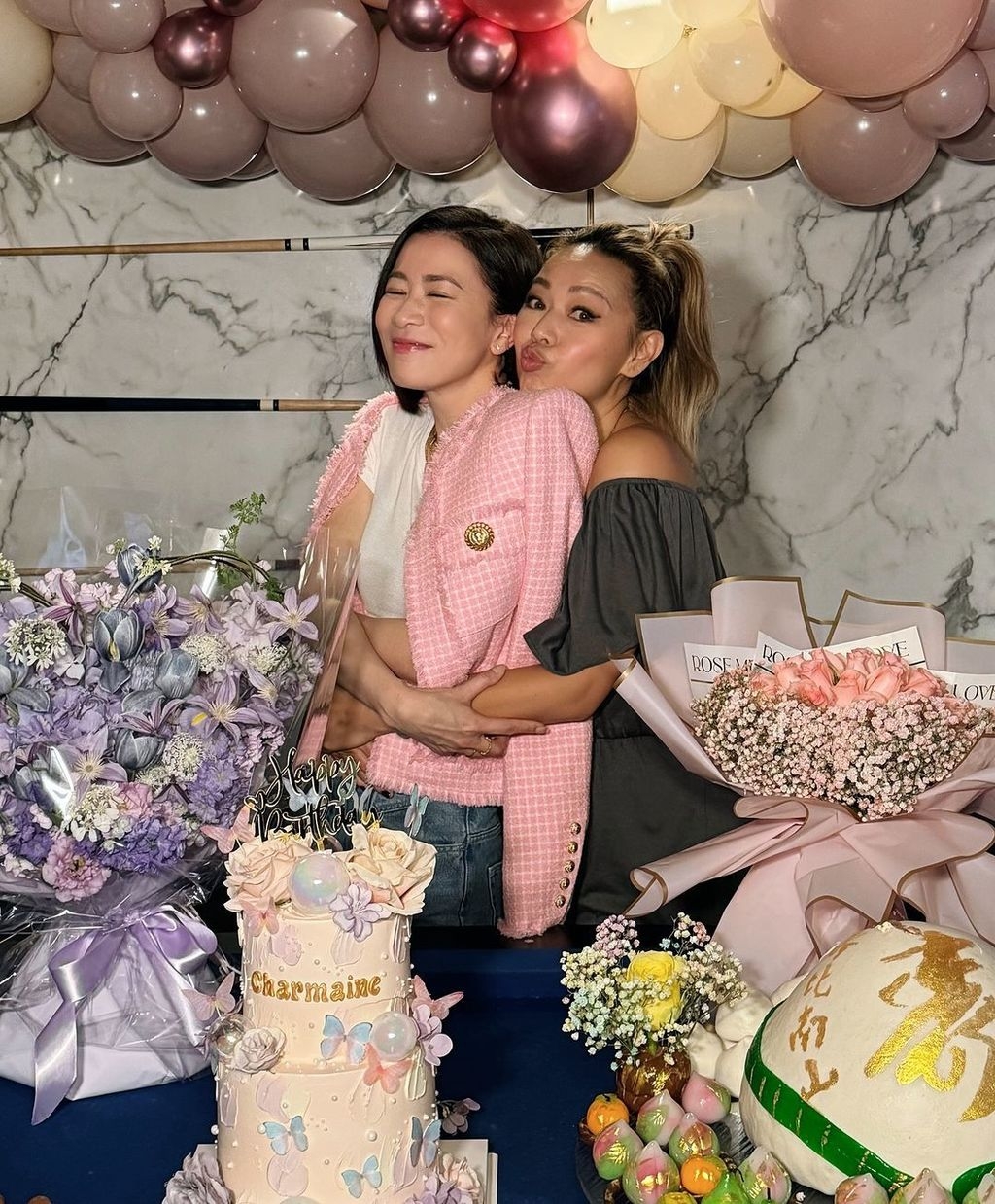 阿佘(29日)還在IG限時動態分享一張美味魚蛋相寫道:「踏入49歲嘅第一日最想食嘅嘢」,原來這麼簡單的美食已經令她很知足,而隨後阿佘曬出雙手抱著滿滿的零食相片,並感謝Dada陳靜:「一個好有愛嘅女仔!Thanks sweetie」,看阿佘笑到看不到眼就知她有多歡喜!而日前剛剛在健身室捕獲的女神黎姿亦送上美美鮮花祝賀壽星,非常感人!許紹雄女兒許惠菁(29日)亦在IG發與阿佘親密抱抱並貼文:「「happiest of birthdays pretty 家姐 」,現場除了有父親許紹雄之外,鍾澍佳、苗僑偉和張兆輝都在場。