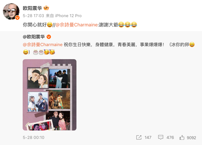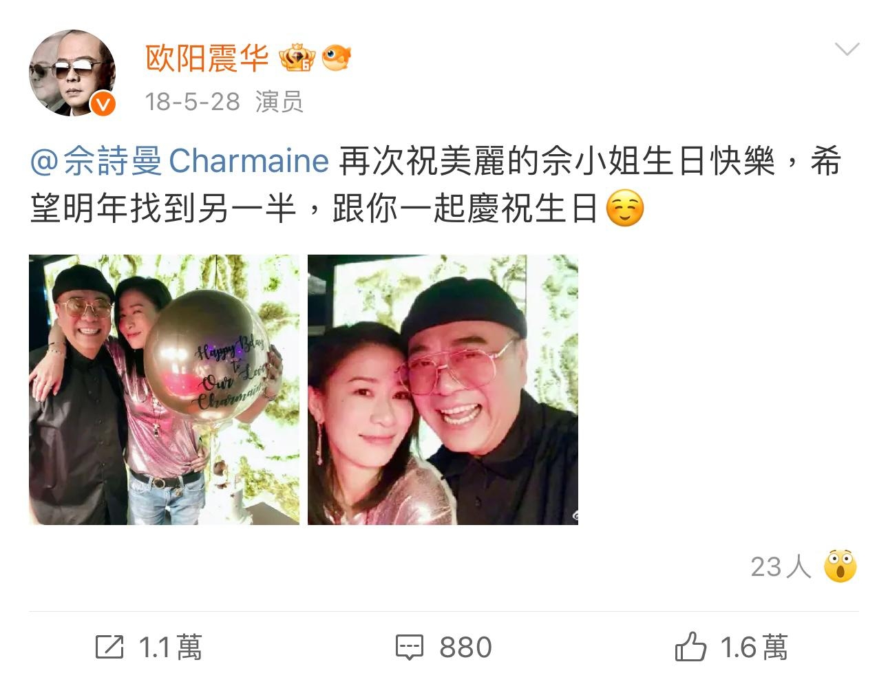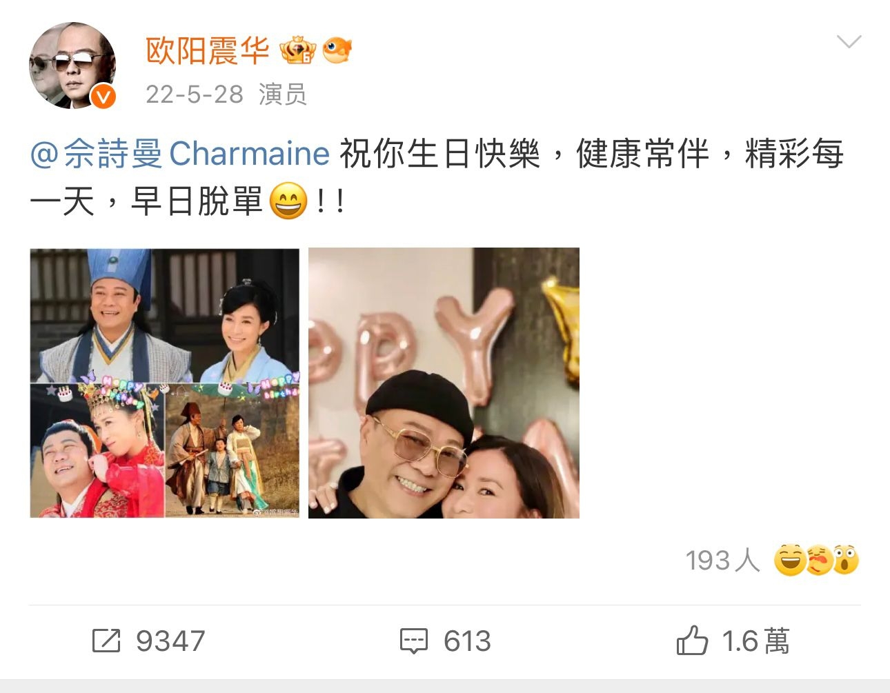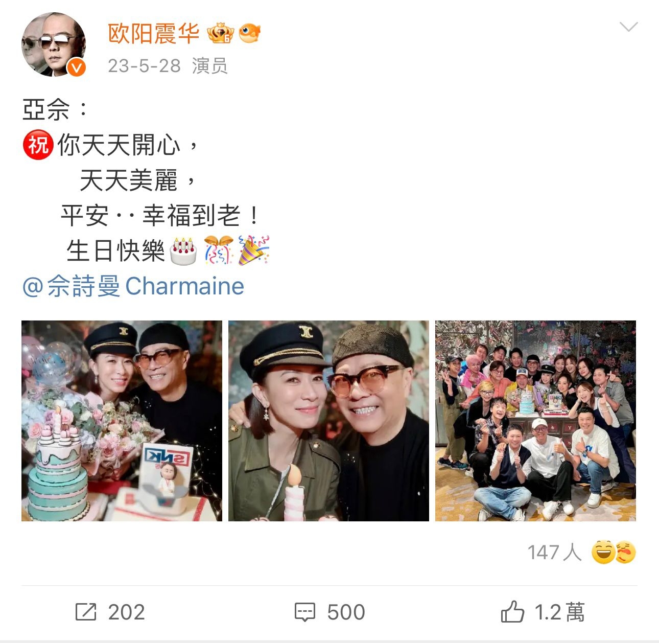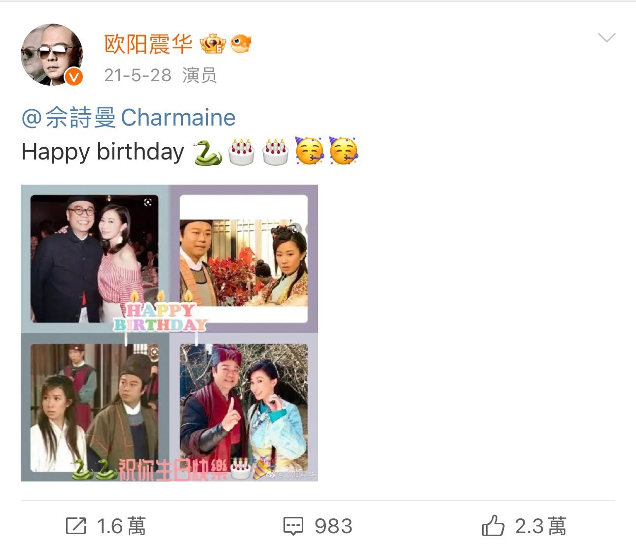 至於一向與阿佘老友鬼鬼,並連續多年曬合照為阿佘慶生的歐陽震華今年也無一例外,在社交平台發合照更罕有送上鬼馬祝福:「祝你生日快樂,身體健康,青春美麗,事業爆爆爆!(冰你的卵)!」阿佘亦回應:「謝謝大爺」,更有粉絲表示:「想不到好多年了還沒忘冰你的卵」,事關二人拍攝內地綜藝時,歐陽震華向阿佘提議「雪卵」而發生的爆笑場口!二人的「神仙友情」亦令人稱羨!