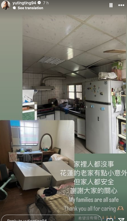 台灣花蓮海域今早(3日)發生7.3級地震,據台灣消防部門統計,截止14時,已累計7死711傷77人受困,形勢嚴峻。不少台灣藝人在網上留言出po報平安,而其中無綫小花余思霆的老家正是花蓮,她也在中午時分發布限時動態向大家說明情況:「家裡人都沒事,花蓮的老家有點小意外,但家人都安全,謝謝大家的關心」,余思霆也貼出了兩張花蓮老家在災後的相片,依相中所見,廚房天花倒塌,房間裡更有「冧櫃」的情況出現,她也為台灣祈願:「希望沒有傷亡🙏」。