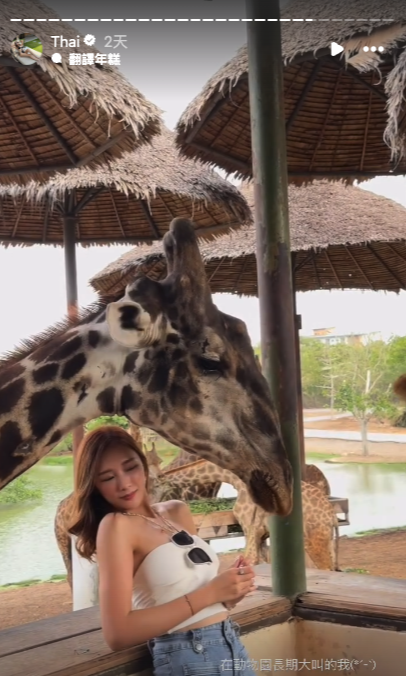 梁允瑜在IG限時動態接連分享旅行短片,在其中一條片中見她去到當地動物園遊玩,由於泰國天氣炎熱,Chloe以清涼著裝示人,身穿牛仔熱褲搭配露肩緊身白Tee。她除了投餵長頸鹿外,更與當地紅毛猩猩合照,不過中途紅毛猩猩竟然將「鹹豬手」伸向Chloe,不單止對其胸擊還將頭完全貼到她肩膀上,令Chloe瞬間花容失色,驚聲尖叫,最後她只能無奈閉眼完成拍攝,過程認真驚心動魄!![]()