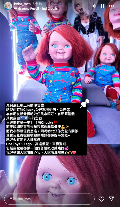 對於網上對其患癌原因的猜測,指Koba年紀輕輕便患癌,與他愛收藏電影《娃鬼回魂》的Chucky公仔有關,Koba亦有回應:「話我由有咗Chucky公仔就開始病、患癌,亦有朋友話覺得啲公仔風水唔好、有邪靈附體。」他解釋道,自己作為粉絲,10年前已收藏第一隻Chucky公仔,「而嗰段期間直到去年我都係非常健康,而我亦相信我患癌,同呢啲公仔係完全冇關係。」並強調收藏公仔只是普通嗜好,亦感激大家關心他。