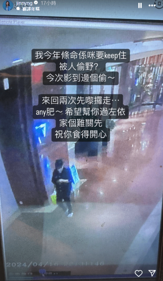 日前吳若希貼出一張閉路電視截圖公開賊人模樣,見圖中一名身穿深色恤衫頭戴Cap帽男子,拿著一個手提袋,發生地點疑似在商場內。她向賊人喊話「我今年條命係咪要keep住被人偷野?今次影到邊個偷~來回兩次先嚟攞走……」,她更無奈地「祝福」對方「any肥~希望幫你過左依家個難關先,祝你食得開心。」大家出門在外,要隨時隨地保持警戒,切勿讓可疑之人有下手機會。