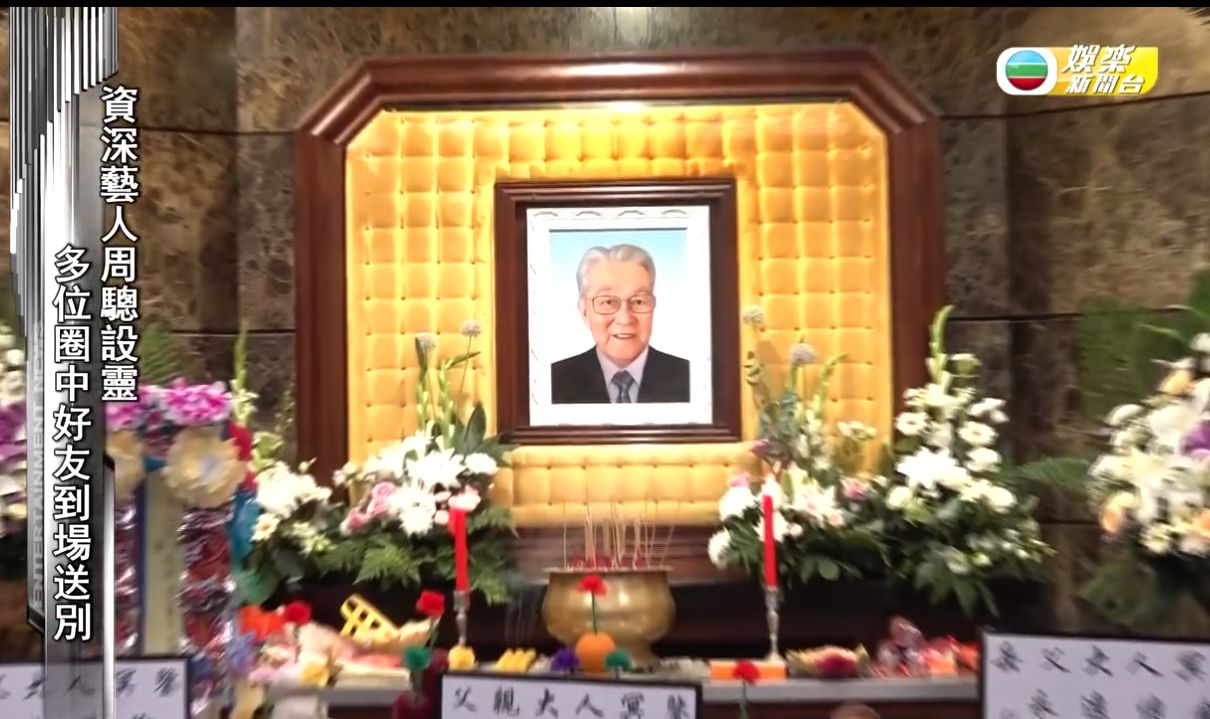 資深演員周驄(原名冼錦榮)早前因病離世,享年92歲。昨日(22日)家屬採用道教及維生教儀式為其設靈,靈堂正中擺有周驄面帶慈祥微笑、身穿西裝的遺照,貫徹他近年形象,橫匾寫有福壽全歸,靈前就擺有家人的花圈。
