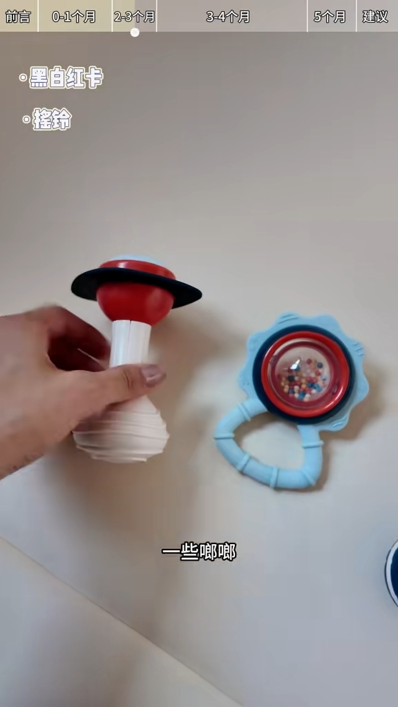 2至3個月大的嬰兒,眼睛視力開始看到不同的顏色,除了黑白之外就是紅色,所以玩黑白卡通常就會變成黑白紅卡,「多了一隻顏色,也是刺激他們的腦部發展,當你給他追蹤時,他們也看到一些更複雜的圖案,同埋這個月齡的BB手腳已經可以郁動得比較多,可以和他們玩一些搖鈴、啷啷,BB聽到聲音在這邊來,看下他可否追蹤到,當他們進步的時候就可以進階拿兩件物件,一件會出聲,一件不出聲,看他們會不會擰向出聲那邊。」