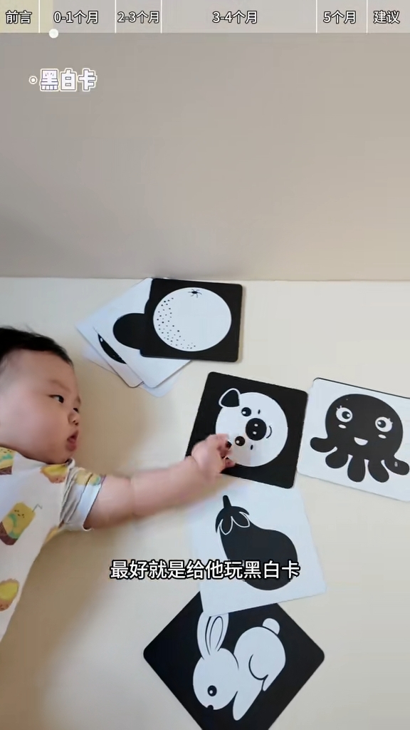 「剛剛出世0至1個月的BB,他們的運動能力有限,大部分時間都在睡覺,視力又未完全發展,所以看東西會好模糊,大概只看到二三十cm的影像」,張寶兒指會為BB選購一些黑白卡,將那張卡擺在距離BB大概20cm的位置,然後就慢慢晃動,這樣就可以訓練得到BB的專注力以及他們的視力也會迅速發展。另外,她也會播一些莫扎特的音樂給袁咕碌聽,「古典音樂可以給人一個比較平和的情緒,二來聽說莫扎特的音樂是可以培養BB的腦部發展更加迅速。」張寶兒又指也有人為這個月齡的BB準備一些安撫的玩具,但她就沒有買安撫玩具給袁咕碌。