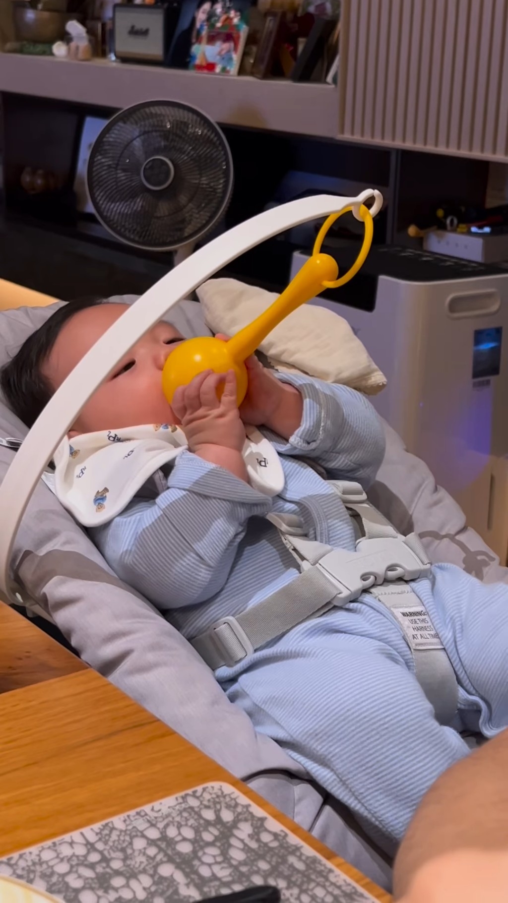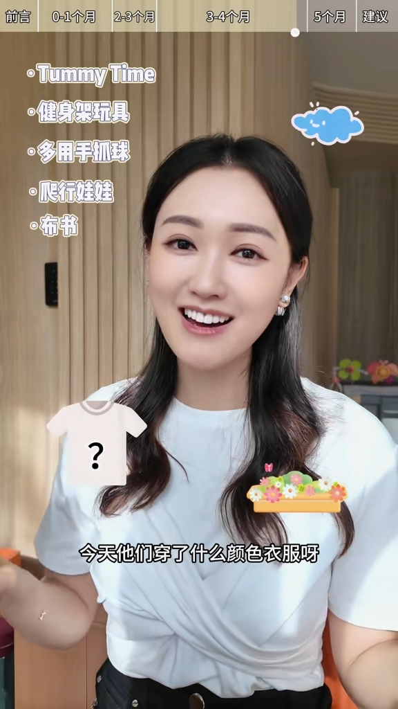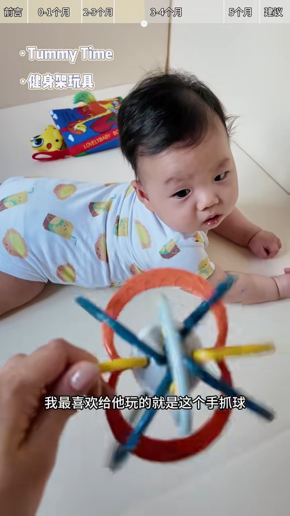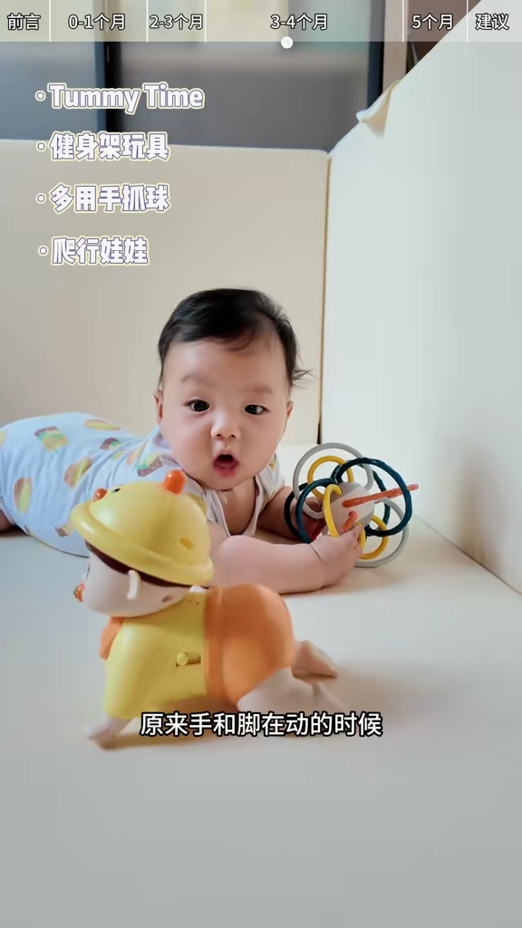 3至4個月的BB開始做到Tummy Time(時不時地趴一會兒),因為他們的頸部、脊椎,各方面的肌肉加強了,所以就可以訓練讓他們多趴,同時又可以幫將他們肚子裡的空氣打嗝吐出來,而BB也開始口欲期,好想放東西進嘴裡,並開始好想抓東西,所以張寶兒會在highchair綁一個好像啷啷的玩具讓袁咕碌自己用手抓,「還有BB在做Tummy time時,我亦買了一個會爬的公仔給他,這個可促進手和腳郁動,幫助他爬行的。另外我好想去培養他一個閱讀的習慣,所以在三四個月的時候,我買了一些布書給BB,布書的優點是撕不爛,第二個優點就是有很多不同的質感,亦會發出不同的聲音,可以刺激BB在了解或聽媽媽講故事的時候,摸到一些東西,可以參與多些,是一個沉浸式的學習。當然我覺得最有用的就是有爸爸媽媽或照顧者有一個很生動的演繹,又要扮不同的聲音給他聽,這亦都是一個語言的學習。」