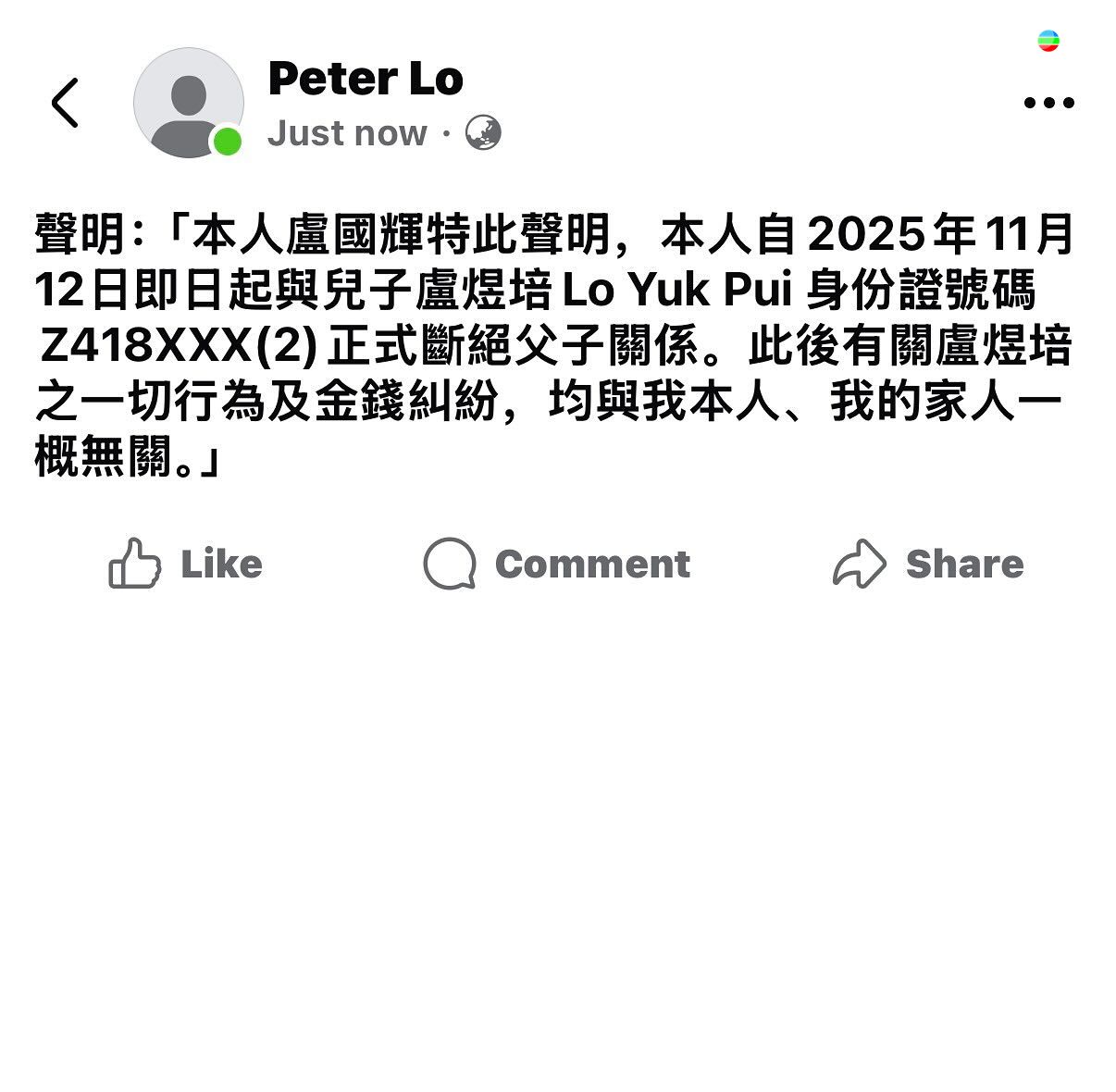 盧爸爸的聲明寫道:「本人盧國輝特此聲明,本人自2025年11月12日即日起與兒子盧煜培 Lo Yuk Pui 身份證號碼Z418XXX(2)正式斷絕父子關係。此後有關盧煜培之一切行為及金錢糾紛,均與我本人、我的家人一概無關。」![]()
