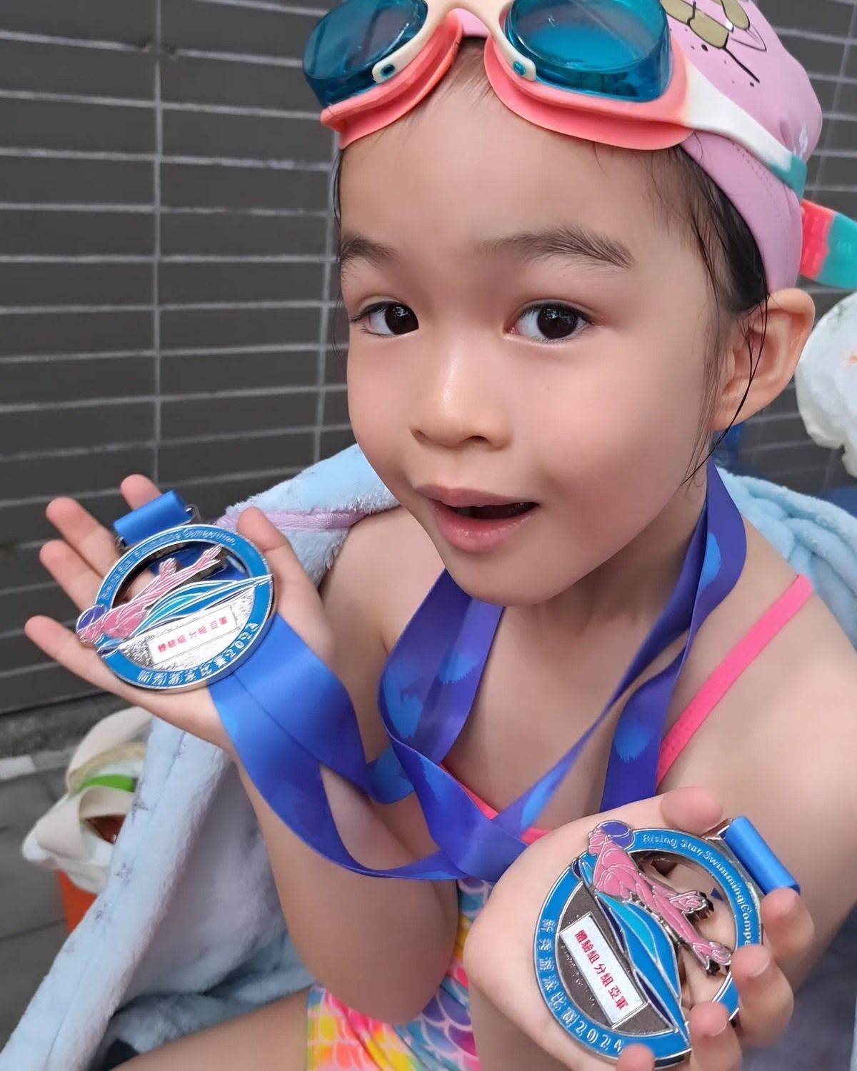 相中見囡囡拿着3面獎牌,一家三口開心合照留念,其中更見Alfa舉V拍照,看來十分開心。據知Alfa去年首次參加游泳比賽時,已勇奪3項亞軍,更打破個人紀錄