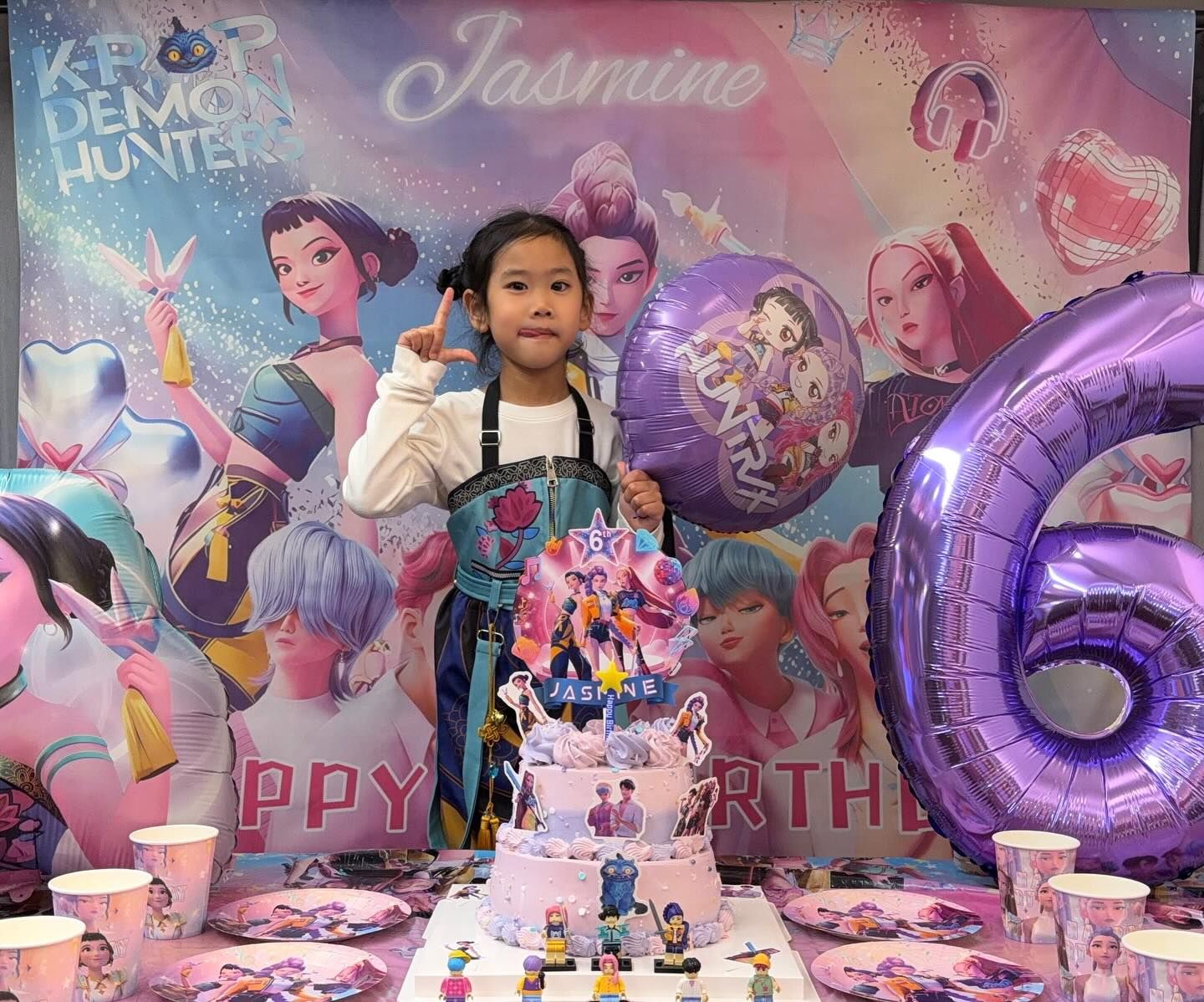 相中可見,生日以近來小朋友大愛的動畫新作《KPOP獵魔女團》為主題,他們不但預備了一大幅橫額,又有「6」字氣球,更有一個兩層的精緻蛋糕,就連杯碟也是《獵魔女團》,相當有心思。