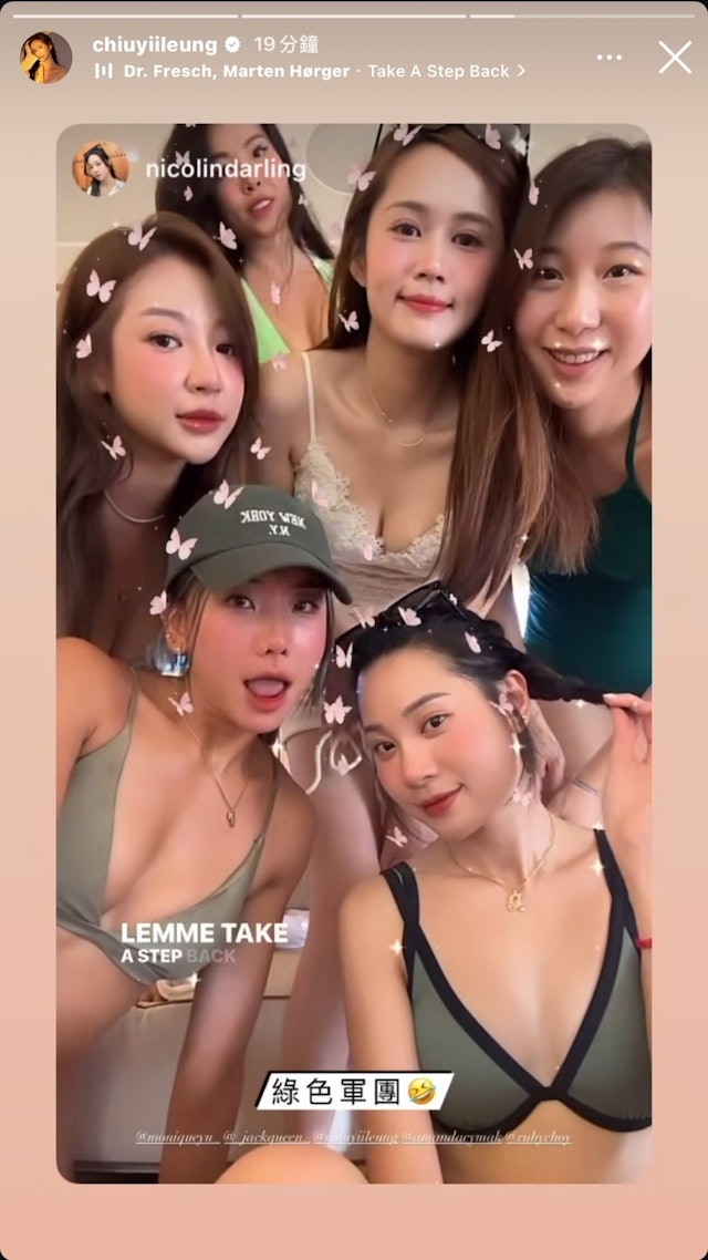 正值酷熱夏季,Joey亦將福利加碼!日前,她分享了多個與一班女仔朋友出海開船P的限時動態,見眾人穿上各款性感泳衣上陣,畫面相當火辣。身穿哩士吊帶小背心、超短裙的Joey身材纖細、皮膚雪白,深長事業線更是相當吸睛。不過由於與好友們齊齊對著鏡頭擺可愛pose時全程彎著腰,領口位置顯得相當大,再加上裙緣不時向上移,許多網民亦擔心Joey有走光風險。![]()