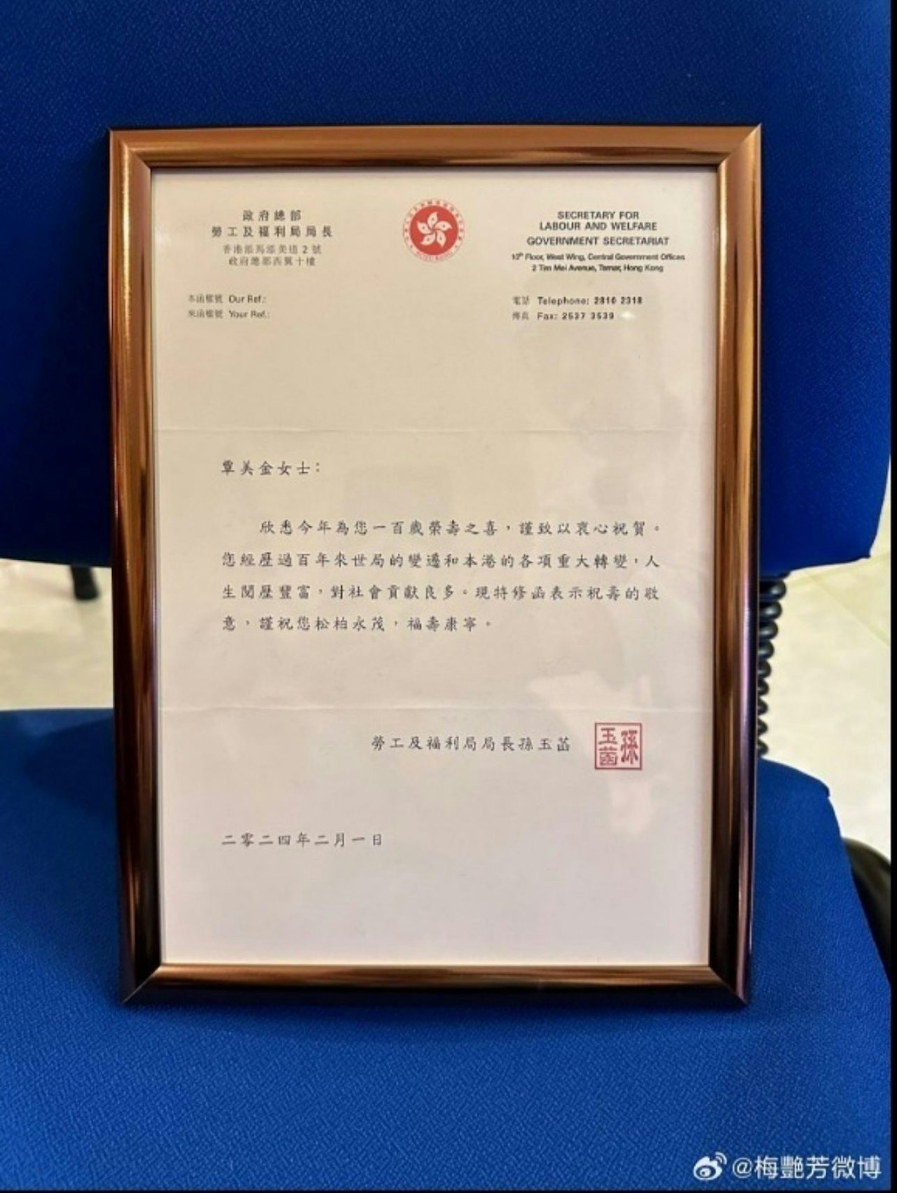除了親朋好友外,梅媽亦獲勞工及福利局局長致送祝壽賀函。別以為這是梅媽獨有,原來自2002年開始,勞福局長會及安老事務委員會主席每年都會向年滿百歲的「老友記」致送賀卡,以表敬意。接著在其後的105歲、和之後的每年都會繼續發賀函,表達對百歲長者的敬意。