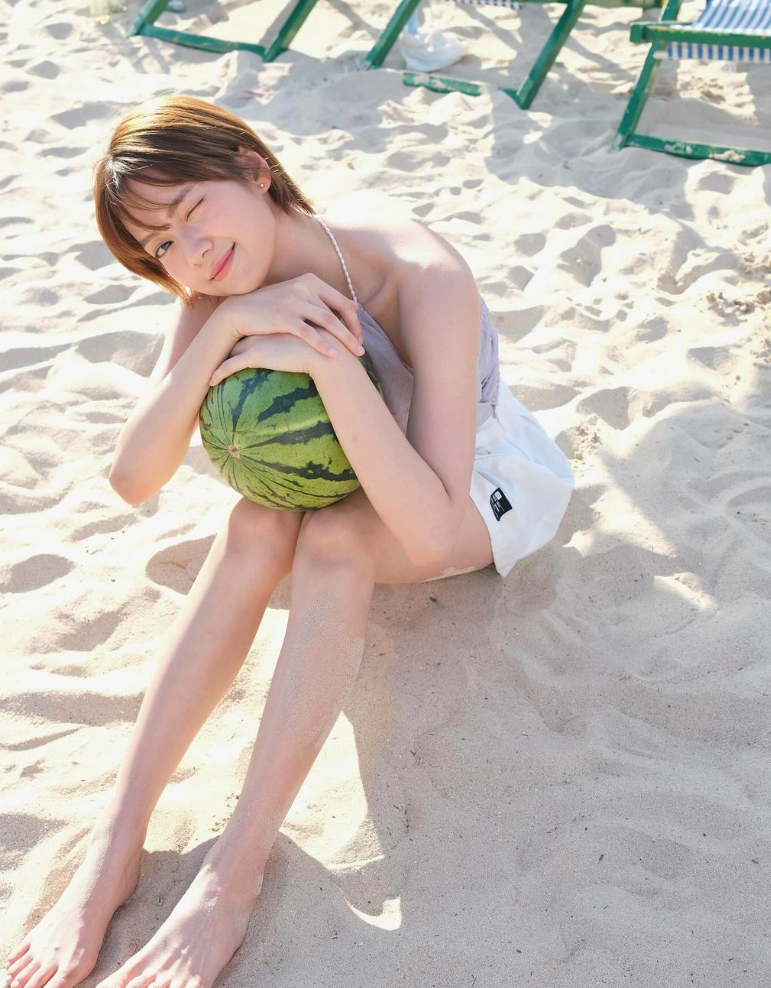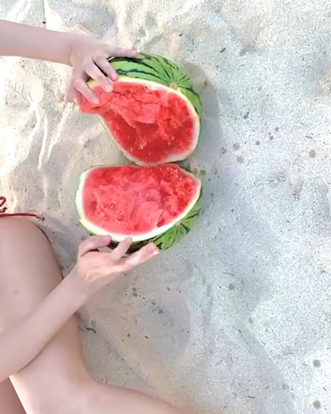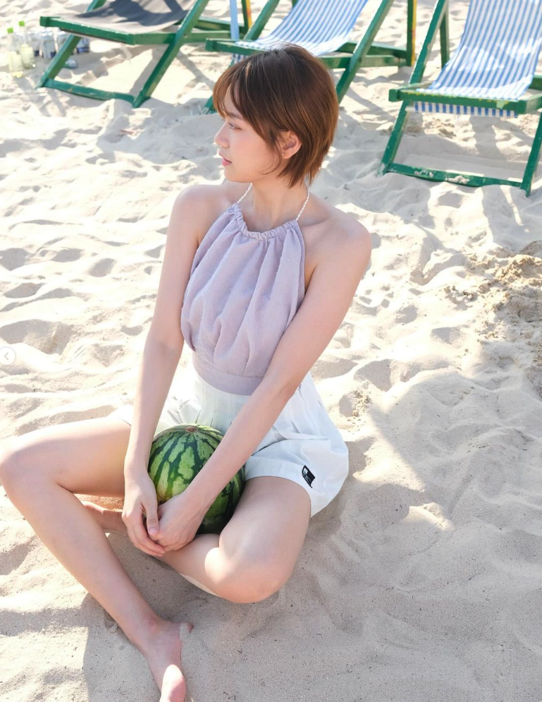 游游(21日)在IG曬出一輯去沙灘玩的美相,更向大家展示她訓練有成的超強技能:「一早已經想試下買粒西瓜係沙灘食,事實證明野外開西瓜係唔需要有工具,只需要力量,掉落沙再用手拉開,做左甘耐gym就係為咗哩一刻hahahaha」相中見她一頭清爽短髮搭配掛頸小背心,白滑長腿及性感鎖骨一覽無遺。![]()
