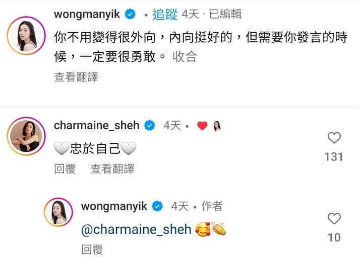 早前,她上載了多張美照,簡單的妝容,把她精緻的五官和白滑的肌膚顯得更美,加上健康和性感美兼備的打扮,成功吸「LIKE」無數。她於貼文寫道:「你不用變得很外向,內向挺好的,但需要你發言的時候,一定要很勇敢。」除了得到網民留言力讚外,亦獲Man姐(佘詩曼) 留言,《新聞女王》團隊再次互動,令粉絲們相當興奮。