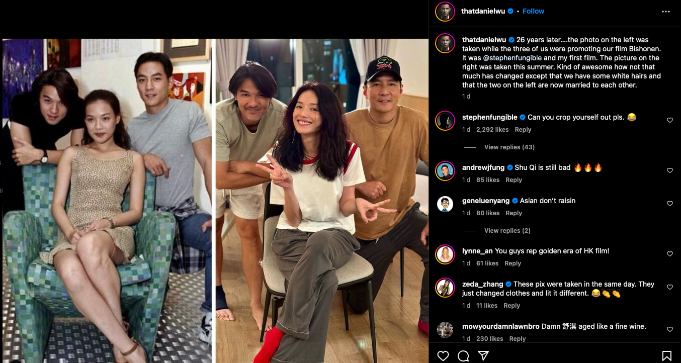 難得再聚首,三位也有派福利給大家!昨日(11日)凌晨,吳彥祖上載一張《美少年之戀》三人組26年前後對比照,他用英文寫道:「26年後...左邊的照片是我們三人宣傳電影《美少年之戀》拍下的。這是馮德倫與我參演的第一部電影,右邊的照片是今年夏天拍的。幸好沒甚麼大改變,除了多了點白頭髮,以及我旁邊的兩位現在已經結婚了」。最搞笑的是,馮德倫竟在評論區留言道:「Can you crop yourself out pls.(請問可以裁走你自己嗎?)」讓吳彥祖不要做電燈膽,罕有與舒淇放閃!![]()