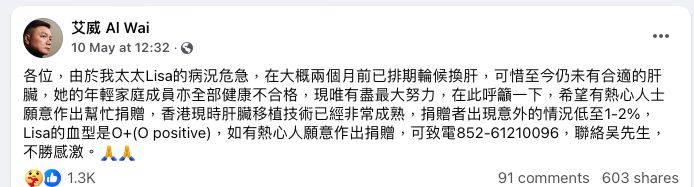 艾威日前為病況危急的愛妻,在社交平台公開呼籲,求熱心人士捐肝,為Lisa續命。最終,獲得十多名與Lisa血型O+脗合的善心人願意相助。