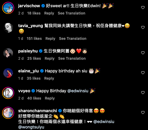 不少圈中好友在評論區留言祝福,如楊茜堯、胡蓓蔚、姚子羚、陳敏之、楊秀惠、周奕瑋等,敏之更評論道:「你哋細個好得意,好想帶你哋返屋企」,回應翠如的貼文,相當有愛~