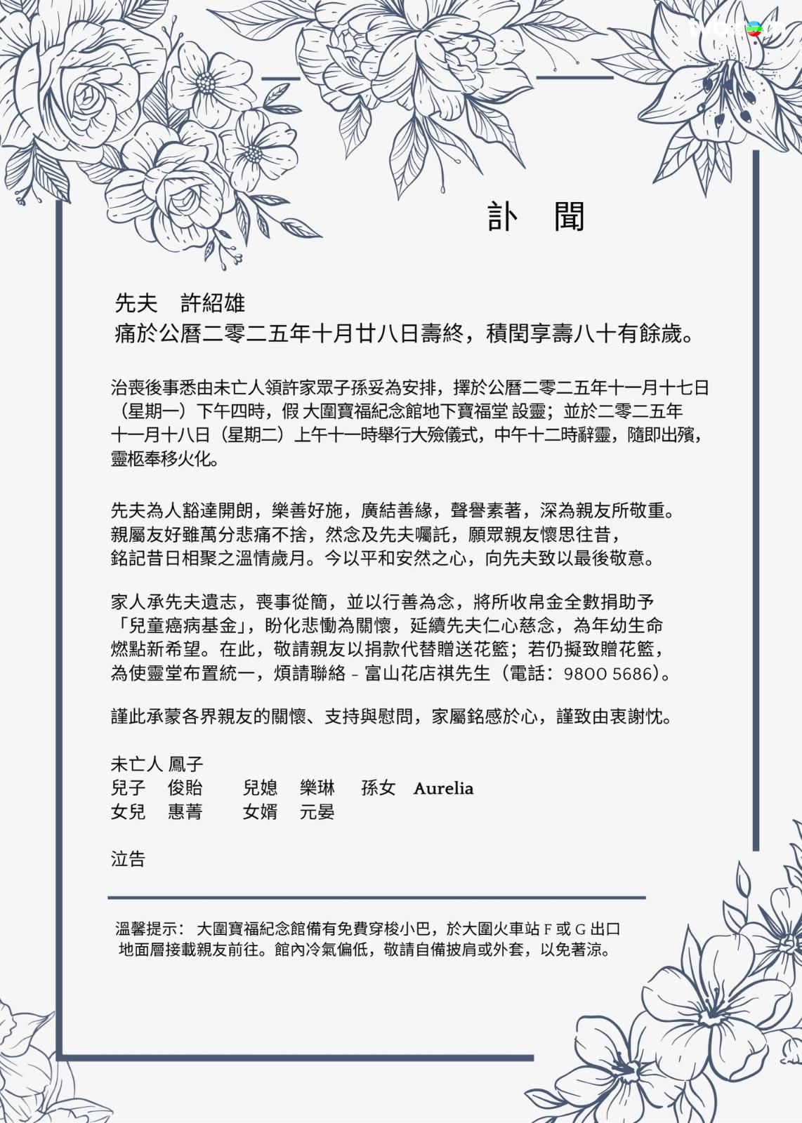 許紹雄Benz雄因病逝世,終年76歲。其家人今日發出訃聞,公布許紹雄的喪禮將於11月17日假大圍寶福紀念館地下寶福堂設靈舉行儀式,翌日(18日)出殯。