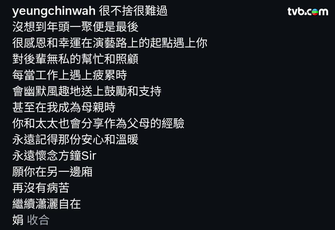 楊千嬅在社交網發文悼念,並以「娟」作署名,留言:「很不捨很難過,沒想到年頭一聚便是最後,很感恩和幸運在演藝路上的起點遇上你,對後輩無私的幫忙和照顧,每當工作上遇上疲累時,會幽默風趣地送上鼓勵和支持,甚至在我成為母親時,你和太太也會分享作為父母的經驗,永遠記得那份安心和溫暖,永遠懷念方鐘Sir,願你在另一邊廂,再沒有病苦,繼續瀟灑自在,娟。」