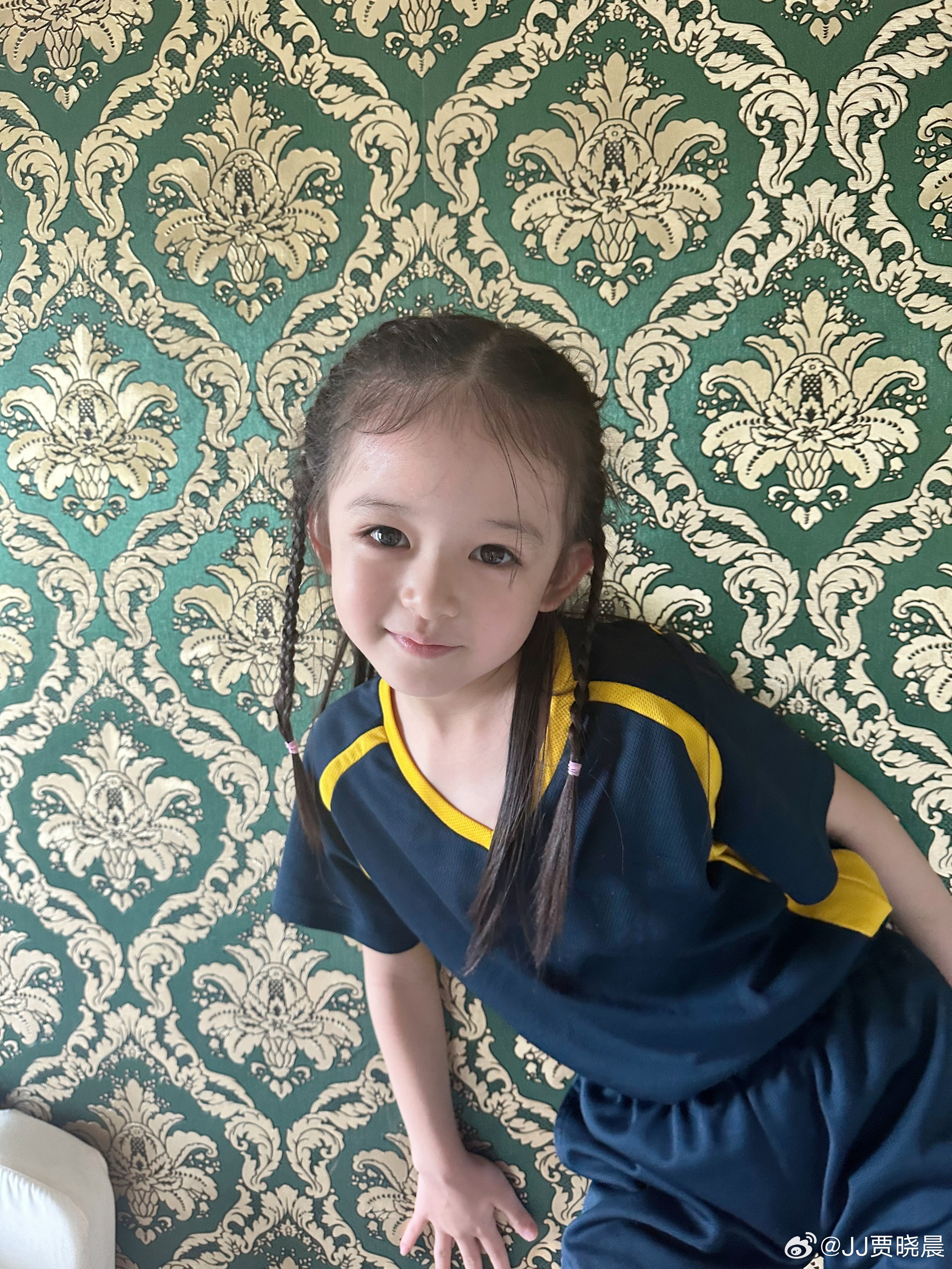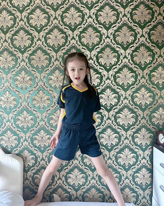 依相片可見,「小飯兜」穿著一套深藍色校服,紮著兩條辮子,邁開兩腿站在床上,靠著牆壁對著鏡頭甜笑,非常識擺pose,鏡頭感十足!雖然「小飯兜」只有不夠7歲,但已經擁有一雙逆天的白滑長腿,而且顏值超高!眼大大,再加上白雪雪嘅肌膚,好似混血兒~。![]()