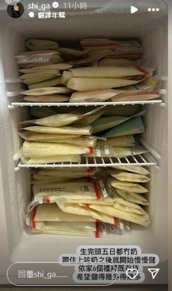 連詩雅(Shiga)7月中順利誕下囡囡,坐月中的她亦不時於社交平台分享湊女經歷以及榮升做新手媽媽的感受。為了給囡囡提供最好的營養,Shiga堅持餵哺母乳,日前她更在IG Story曬出成果:「生完頭五日都無奶,跟住上咗奶之後就開始慢慢儲,依家6個禮拜嘅存貨,希望儲得幾多得幾多。」依相可見,一袋袋母乳塞爆三層雪櫃,相當震撼。