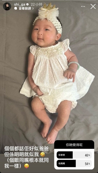 Shiga亦不忘為囡囡影下多輯初生寫真,近兩個月大的Camila臉圓圓,眼仔碌碌,非常得意!瞬間俘虜大批網民,更有不少人都認為囡囡激似爸爸陳家樂,猶如「餅印」。Shiga見到不免呷醋,她還隨即發起網上投票,並留言:「個個都話佢好似爸爸,但係明明就似我(個眼同嘴根本就同我一樣)。」從大家的投票比列顯示,有54%認為像媽媽,而46%則認為像爸爸。相信Shiga對於這個投票結果會感到很滿意。![]()