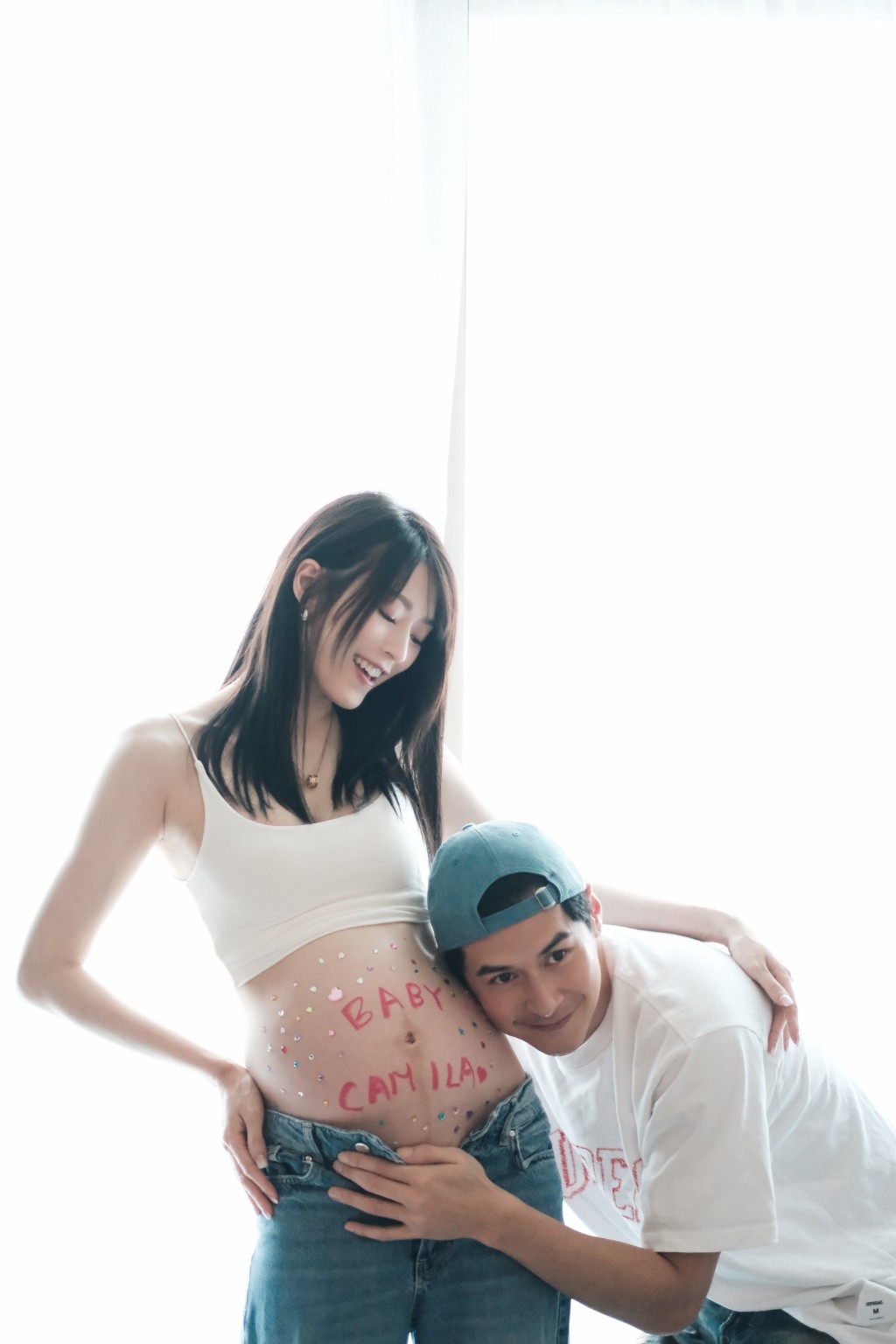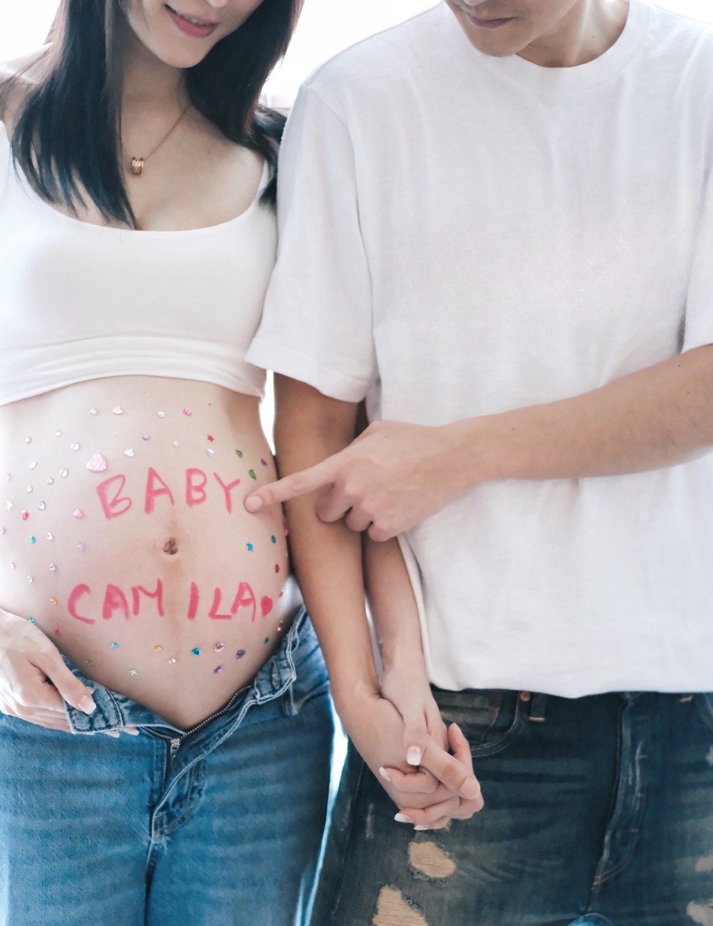 5月28日,懷孕8個月的Shiga在IG分享大肚寫真,肚皮上面似用粉色唇膏寫上:「Baby Camila」字眼,正式公布胎兒的性別是女生!Shiga更用幾十個立體閃鑽貼紙,將「Baby Camila」包圍起來:「31 weeks,好期待與Baby Camila 見面!#inaround2months #bb已經三磅半啦 #期待又緊張 #itsaGIRL」。好友孫慧雪留言:「咁堆男仔衫仔唔啱BB啦!」,而湯怡則回覆雪雪:「呢個唔啱,下個可能啱呢!」似乎暗指兩公婆有二胎打算。