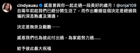 無綫三屆視帝郭晉安昨晚(2日)無預警在IG宣布與小15歲的老婆歐倩怡結束18年婚姻,消息震驚娛圈。先是安仔分享了一張帶有彩虹的照片,背景地點是在內地一個籃球中心,他留言道:「感恩曾與你一起走過的歲月。@cindyauau,自兩年前起我們已經分開生活了,經過雙方深思熟慮及溝通,最後,我們決定離婚了。這個決定是無奈及艱難......感恩我們也曾經為彼此付出過,為家庭努力過,最後寄予妳最大的祝福。」而歐倩怡也緊跟著在IG分享同一篇文章,不過就換上一張櫻花照,令人不禁聯想到二人感情如花般逝去,實在惋惜。