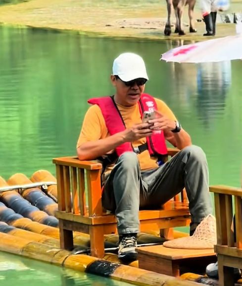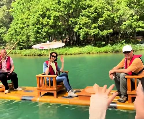 身旁的影帝劉青雲則一如既往貼地,身穿橙色T恤戴鴨舌帽,毫無巨星架子。當二人並肩坐在竹筏漂流被遊客認出時,反應截然不同:郭藹明心情極佳不停大方揮手,展現親和力;而劉青雲則似乎有些「怕醜」,微笑著打完招呼之後默默低下頭玩手機。