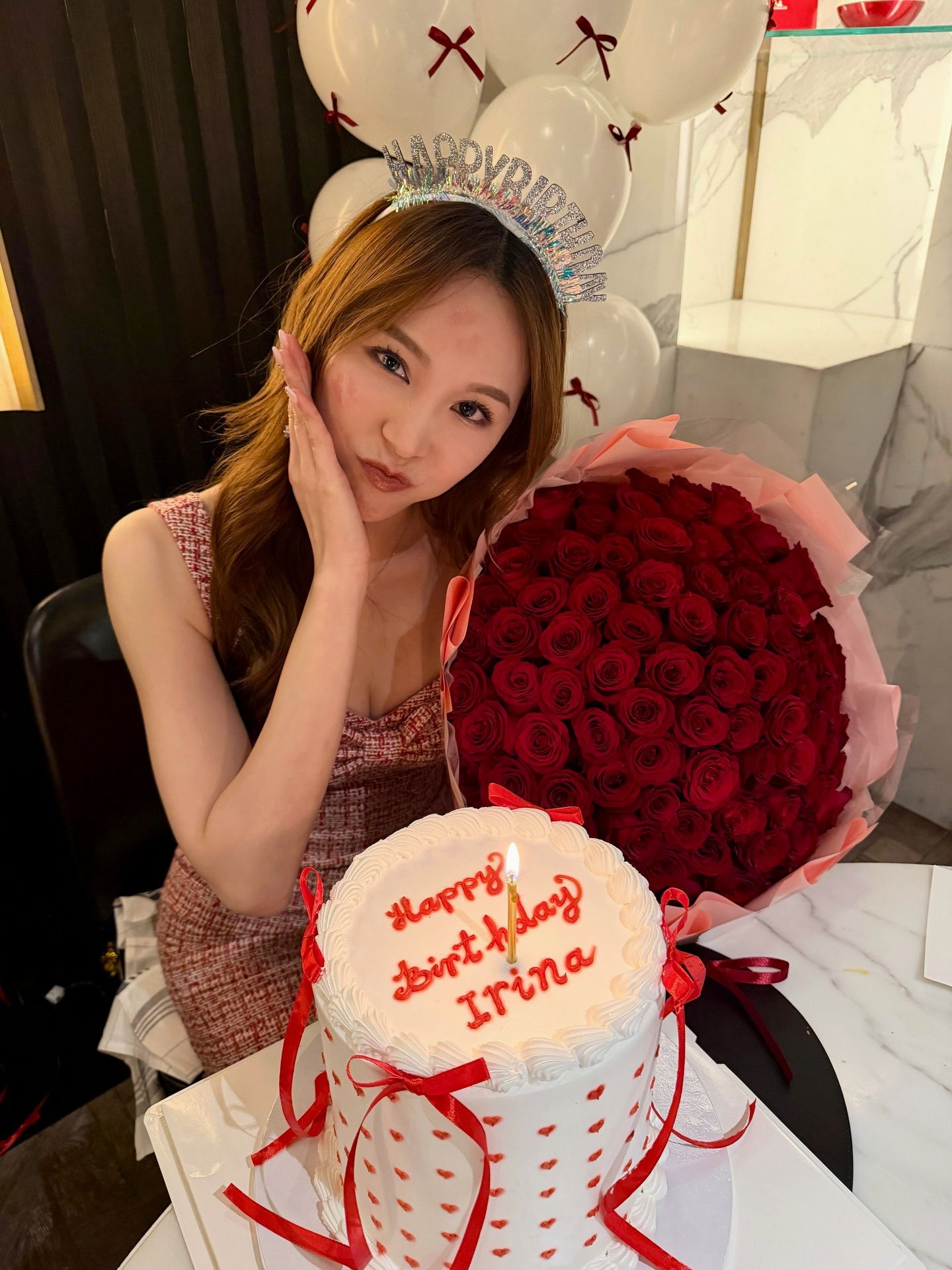 相中見她們預備了白色氣球,又送上一大紮玫瑰花和精緻蛋糕,氹得壽星女相當開心。除了單獨照外,其中一張她們更齊齊大擺鬼臉,當中葉蒨文擺出鬥雞眼加伸脷,認真趣怪。
