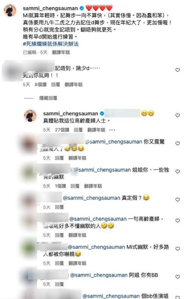 51歲鄭秀文去年5月因為確診新冠肺炎,不少工作都被迫暫停,演唱會及所有排練更無奈延期,令她非常自責。其社交平台自7月開始也停止更新,直至今年1月起Sammi才開始分享近況。休息大半年的Sammi也開始為個唱做準備,不時於IG分享健身及排練演唱會影片,日前她在一條練舞短片下的留言就在網上引起「軒然大波」。事關有粉絲暖心稱:「記唔到,跳少d……見到你就夠」,Sammi隨後回覆表示:「真體貼我這位高齡產婦人士!」瞬間嚇窒一眾粉絲,不少網民更猜測長時間甚少公開露面的她是否秘密生子,引起熱議!