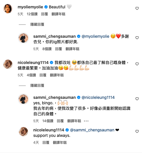曾經Sammi因為過度消瘦的身材令不少粉絲擔心其身體狀況,從Sammi最近po出的生活照看出,她的狀態大好,面部更加飽滿,獲網民大讚絲毫未走樣。原來她也默默作出改變。Sammi貼文表示:「其實,努力健身和改變飲食習慣,身型比例更健康了。Shoulder 更寬更有肌,身體的肌肉量增多。喜歡「現在更健康的自己」和「更健康的心態」。」
