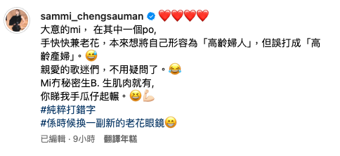 時隔幾日,Sammi週五(19日)發文就烏龍事件作出澄清:「大意的mi,在其中一個po,手快快兼老花,本來想將自己形容為「高齡婦人」,但誤打成「高齡產婦」。親愛的歌迷們,不用疑問了。Mi冇秘密生B. 生肌肉就有,你睇我手瓜仔起輾。」並自嘲「係時候換一副新的老花眼鏡」,網民都大呼「呢位婦人」太可愛,更有粉絲回覆:「咪係陀著個演唱會未出生囉,七月預產期,演唱會誕生。」認真幽默!